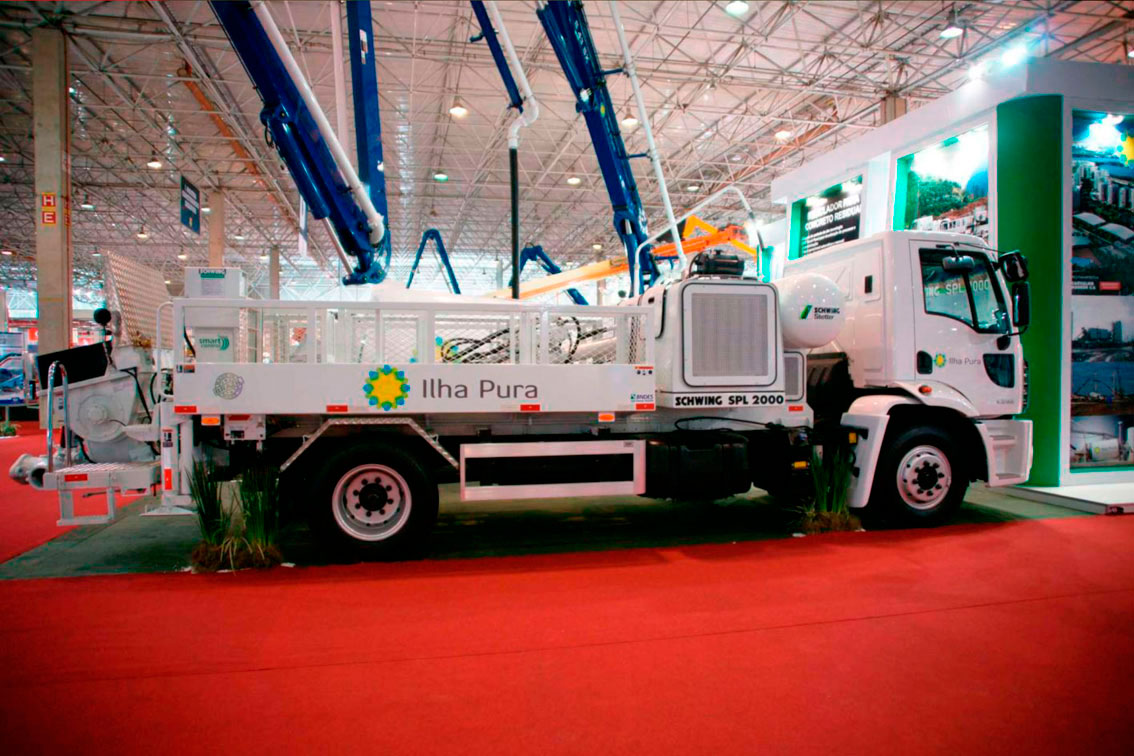 Case do projeto Ilha Pura (Vila dos Atletas), no Rio de Janeiro, foi tema do estande que teve maquete da obra e exibição dos equipamentos utilizados no canteiro onde a empresa é responsável por 90% do concreto fabricado nas centrais misturadoras.