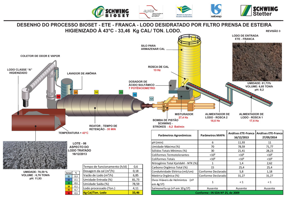 Projeto Piloto em Campinas Na ETE Anhumas da SANASA em Campinas o objetivo foi higienizar o lodo à 70°C, para ser posteriormente utilizado como corretor de PH do solo, na cultura de cana de açúcar. Esse processo atende aos parâmetros estabelecidos pelo MAPA (Ministério da Agricultura, Pecuária e Abastecimento), podendo ser registrado como fertilizante orgânico, ou condicionador de solo. “Na verdade, o equipamento já atende a todas as diretrizes americanas da Agência de Proteção ao Meio Ambiente dos Estados Unidos, EPA onde temos todos os certificados obtidos e mais de 17 projetos de grande porte higienizando lodo e aplicando na agricultura. Em alguns casos é feito o enriquecimento de nutrientes para aumentar seu potencial agronômico, dependendo do tipo de cultura que se deseja aplicar”, diz Ralf.Amostra de Entrada do Equipamento