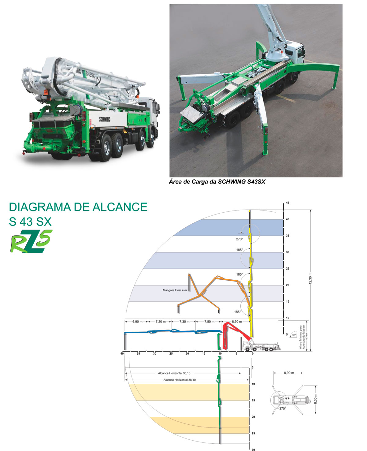 “Fabricado no Brasil, (Código FINAME: 3023734), com a mais alta e confiável tecnologia do mercado mundial, o equipamento SCHWING S 43 SX possui design exclusivo com mastro de 5 seções abertura RZ5 (Roll-and-Fold Desdobramento e sistema “Z”), sistema de estabilização SUPER X que otimiza o espaço entre os pés de apoio facilitando a operação e manutenção, focando também a segurança no trabalho. Sucesso nas obras de todo o mundo, tanto em bombeamentos em grandes cidades quanto em grandes canteiros de obra.”, completa Polachini.
