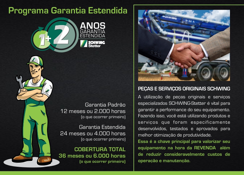 A compra de equipamento SCHWING-Stetter é um momento especial. Queremos que você se sinta satisfeito com essa decisão por muito tempo e é por isso que criamos o Programa de Garantia Estendida SCHWING-Stetter. Este programa é uma maneira de estender a proteção do seu equipamento para um período além da garantia padrão de fábrica, oferecendo uma proteção eficaz contra despesas inesperadas e a garantia de uma manutenção de qualidade realizada por nossa equipe.