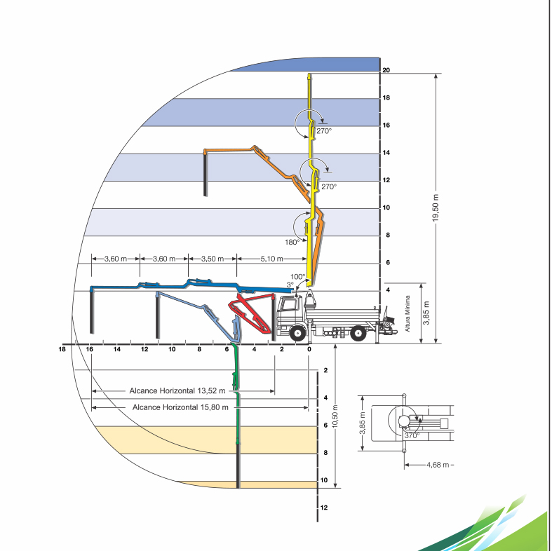 Estes equipamentos foram projetados e desenvolvidos para trabalhar nas pequenas, médias e grandes obras, com a máxima eficiência, confiabilidade e rentabilidade e excelente relação custo/benefício. Conta com kit para bombeamento de alta performance, mastro de distribuição com excelente diagrama de alcance, compartimentos ideais para o  transporte de tubulação e acessórios de concreto, pequeno espaço físico para estabilização e abertura do mastro.