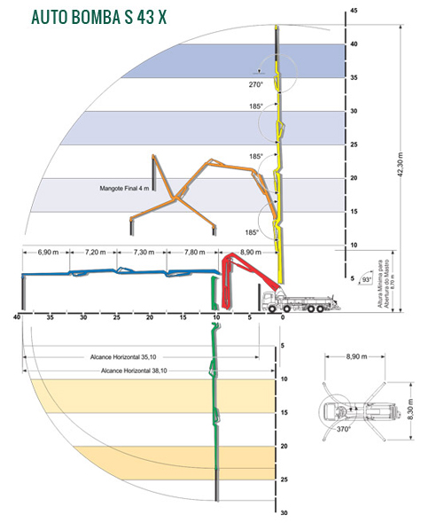 Estes equipamentos foram projetados e desenvolvidos para trabalhar nas pequenas, médias e grandes obras, com a máxima eficiência, confiabilidade e rentabilidade e excelente relação custo/benefício. Conta com kit para bombeamento de alta performance, mastro de distribuição com excelente diagrama de alcance, compartimentos ideais para o transporte de tubulação e acessórios de concreto, pequeno espaço físico para estabilização e abertura do mastro.