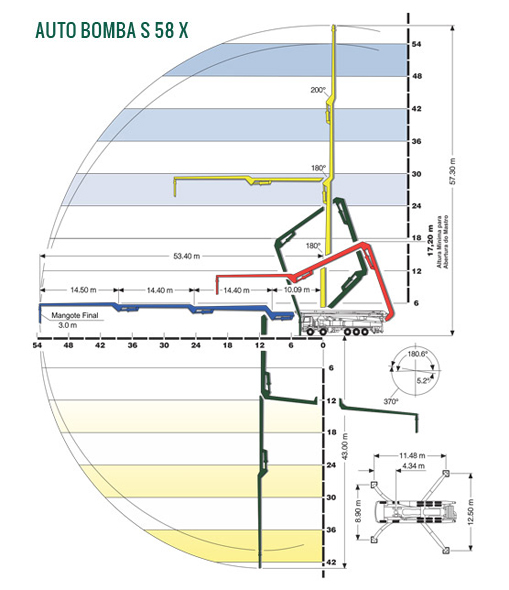 Estes equipamentos foram projetados e desenvolvidos para trabalhar nas pequenas, médias e grandes obras, com a máxima eficiência, confiabilidade e rentabilidade e excelente relação custo/benefício. Conta com kit para bombeamento de alta performance, mastro de distribuição com excelente diagrama de alcance, compartimentos ideais para o  transporte de tubulação e acessórios de concreto, pequeno espaço físico para estabilização e abertura do mastro.