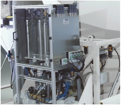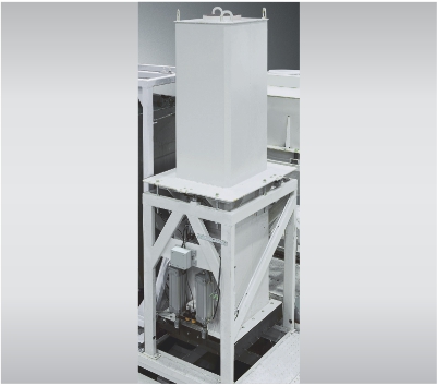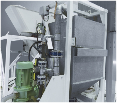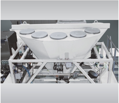 Este sistema permite la dosificación de hielo en copos o escamas directamente en la Mezcladora. La parte inferior de las paredes está un poco inclinada hacia el exterior para garantizar el vaciado total del depósito de pesaje.