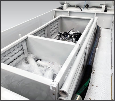 Portas laterais leves e resistentes em alumínio, área de carga com suportes para tubulação rígida e flexível, caixa para acessórios, plataforma de trabalho e escada articulada. Ergonomia, segurança e facilidade operacional.