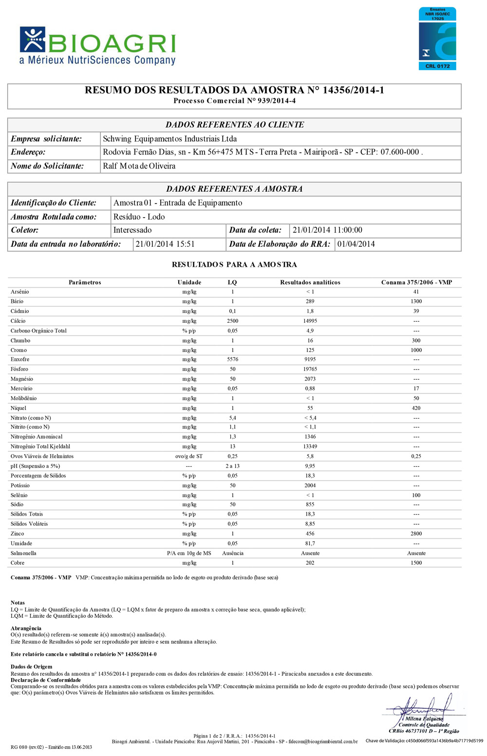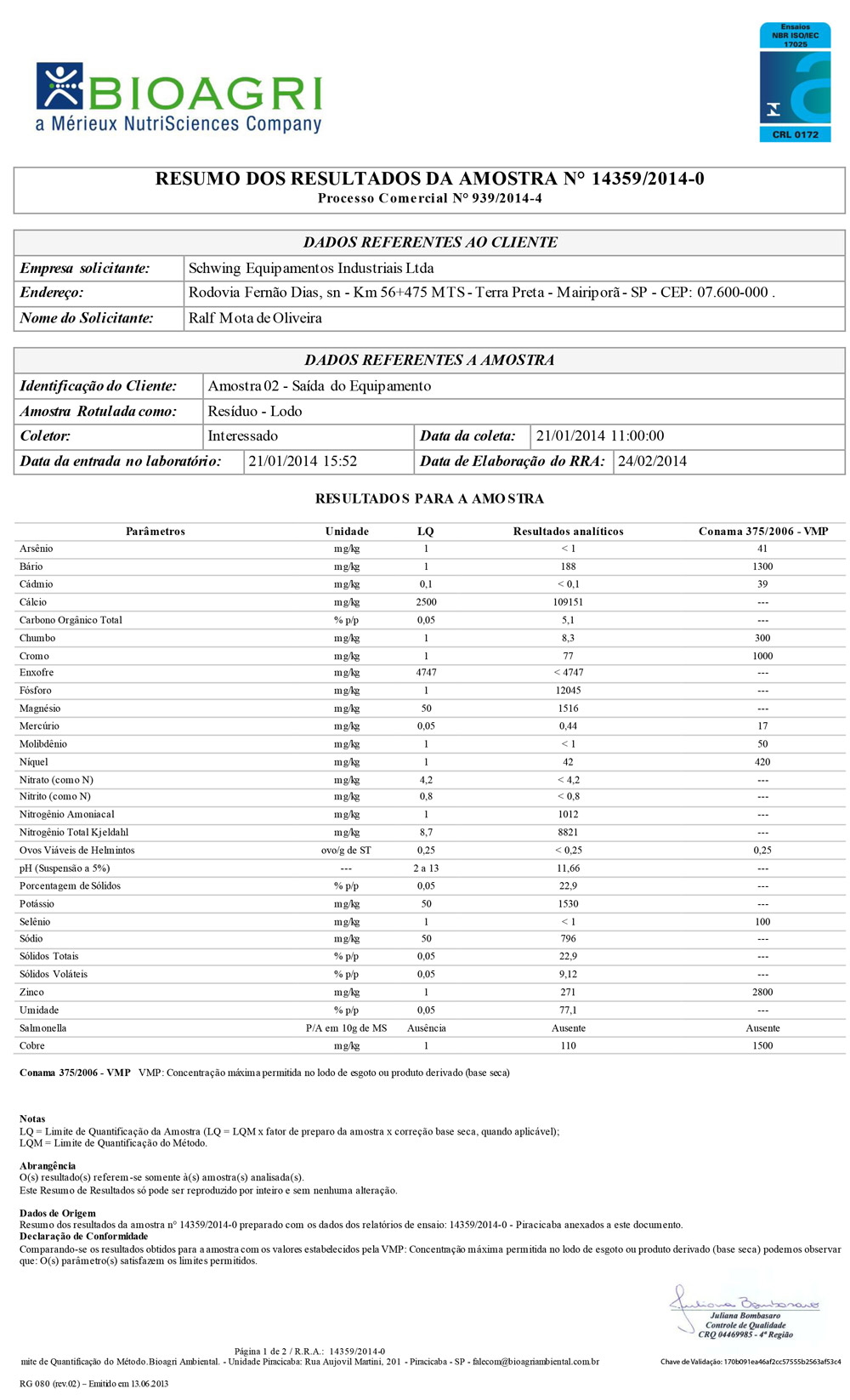 Projeto Piloto em Campinas Na ETE Anhumas da SANASA em Campinas o objetivo foi higienizar o lodo à 70°C, para ser posteriormente utilizado como corretor de PH do solo, na cultura de cana de açúcar. Esse processo atende aos parâmetros estabelecidos pelo MAPA (Ministério da Agricultura, Pecuária e Abastecimento), podendo ser registrado como fertilizante orgânico, ou condicionador de solo. “Na verdade, o equipamento já atende a todas as diretrizes americanas da Agência de Proteção ao Meio Ambiente dos Estados Unidos, EPA onde temos todos os certificados obtidos e mais de 17 projetos de grande porte higienizando lodo e aplicando na agricultura. Em alguns casos é feito o enriquecimento de nutrientes para aumentar seu potencial agronômico, dependendo do tipo de cultura que se deseja aplicar”, diz Ralf.Amostra de Entrada do Equipamento